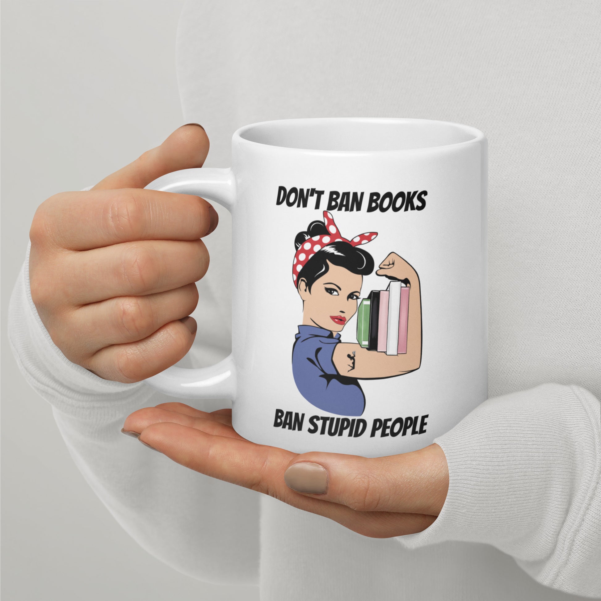 Looking for a fun addition to your caffeinated mornings? The Don't Ban Books Ban Stupid People Mug ceramic mug is sure to put a smile on your face! It’s dishwasher-safe and perfect for everyday use.