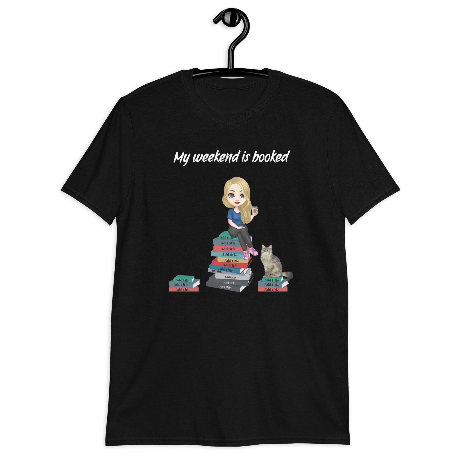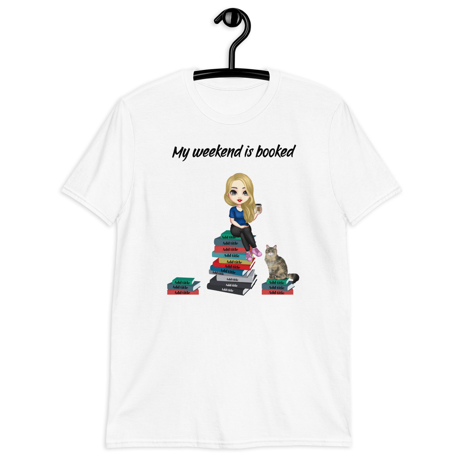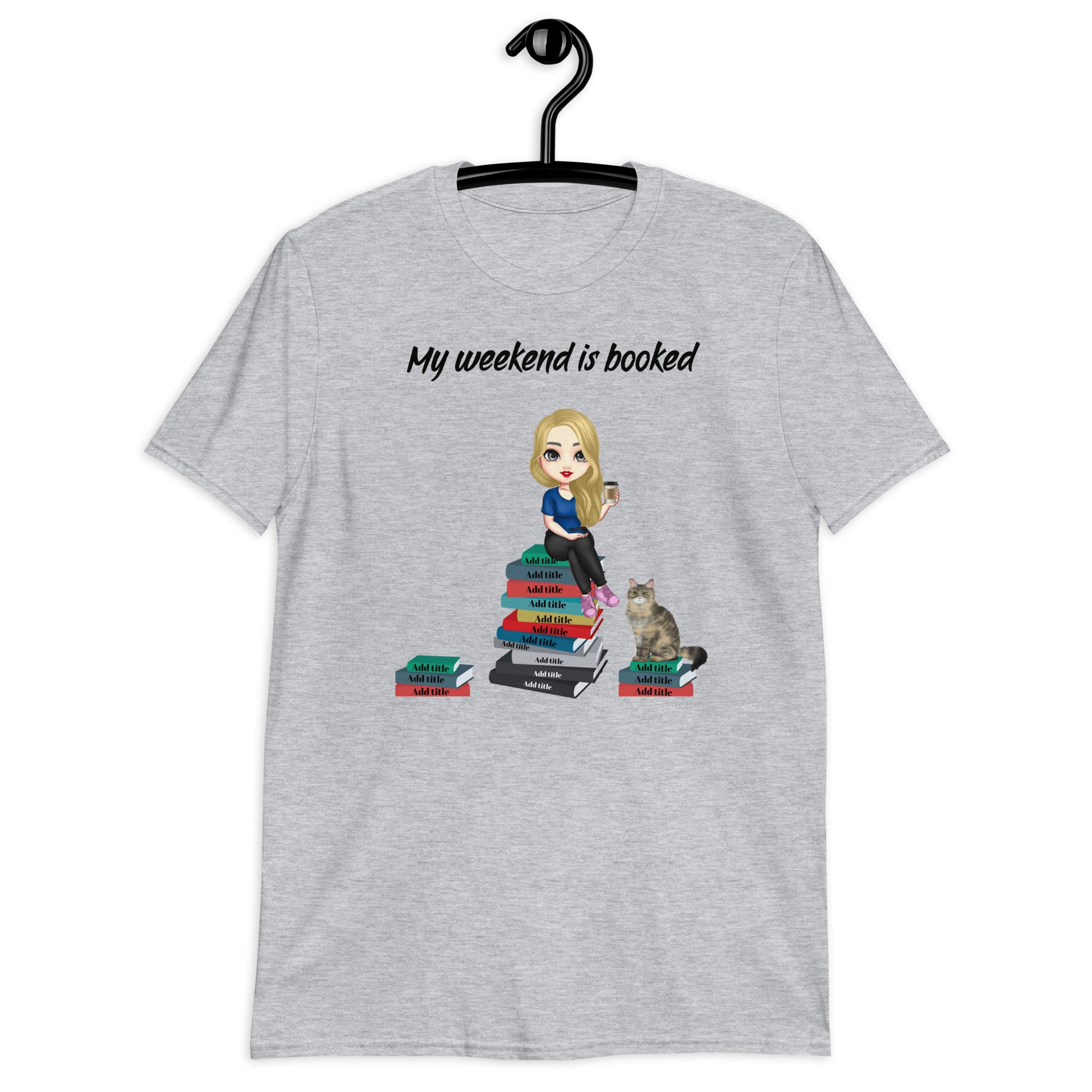 The My Weekend is All Booked t-shirt is the perfect gift for book and pet lovers. Personalize this t-shirt with your favorite book titles, cat/dog, author names, hairstyles, clothes, beverages, and more. This shirt makes an excellent gift for yourself or a book bestie.