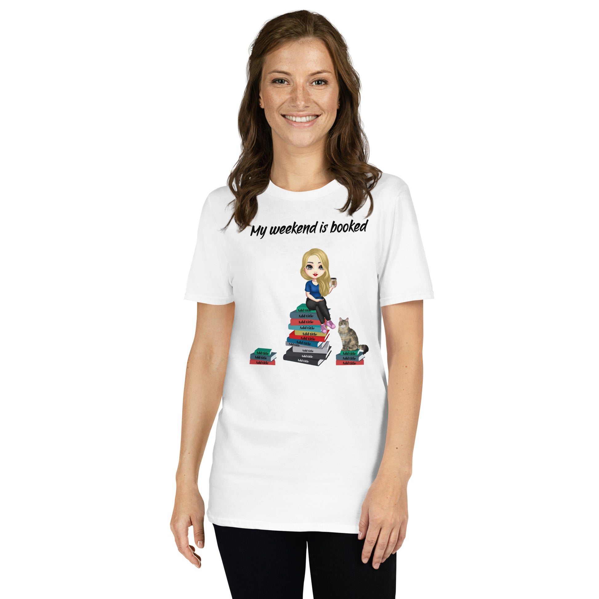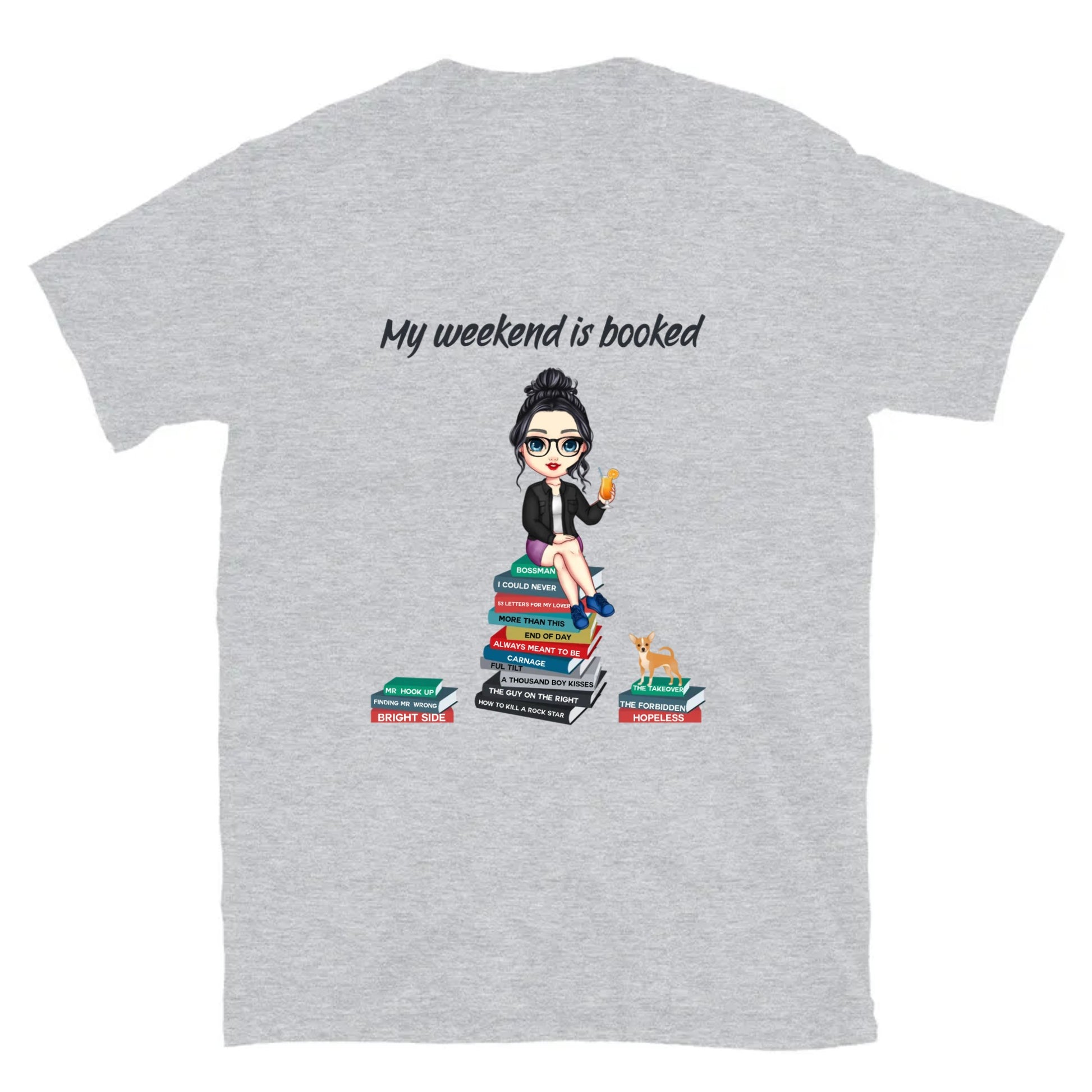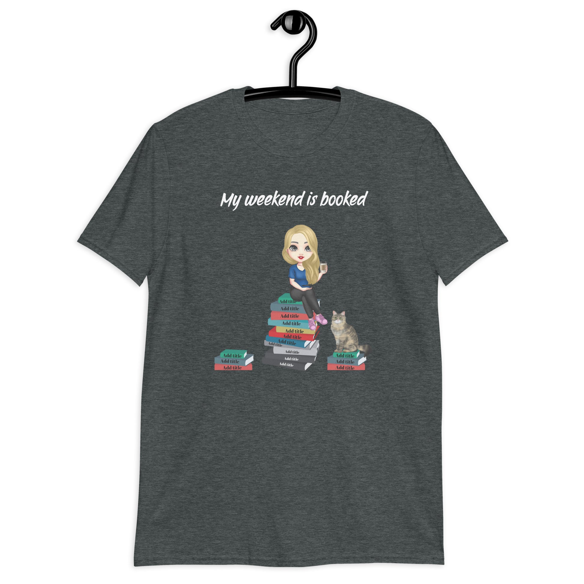 The My Weekend is All Booked t-shirt is the perfect gift for book and pet lovers. Personalize this t-shirt with your favorite book titles, cat/dog, author names, hairstyles, clothes, beverages, and more. This shirt makes an excellent gift for yourself or a book bestie.