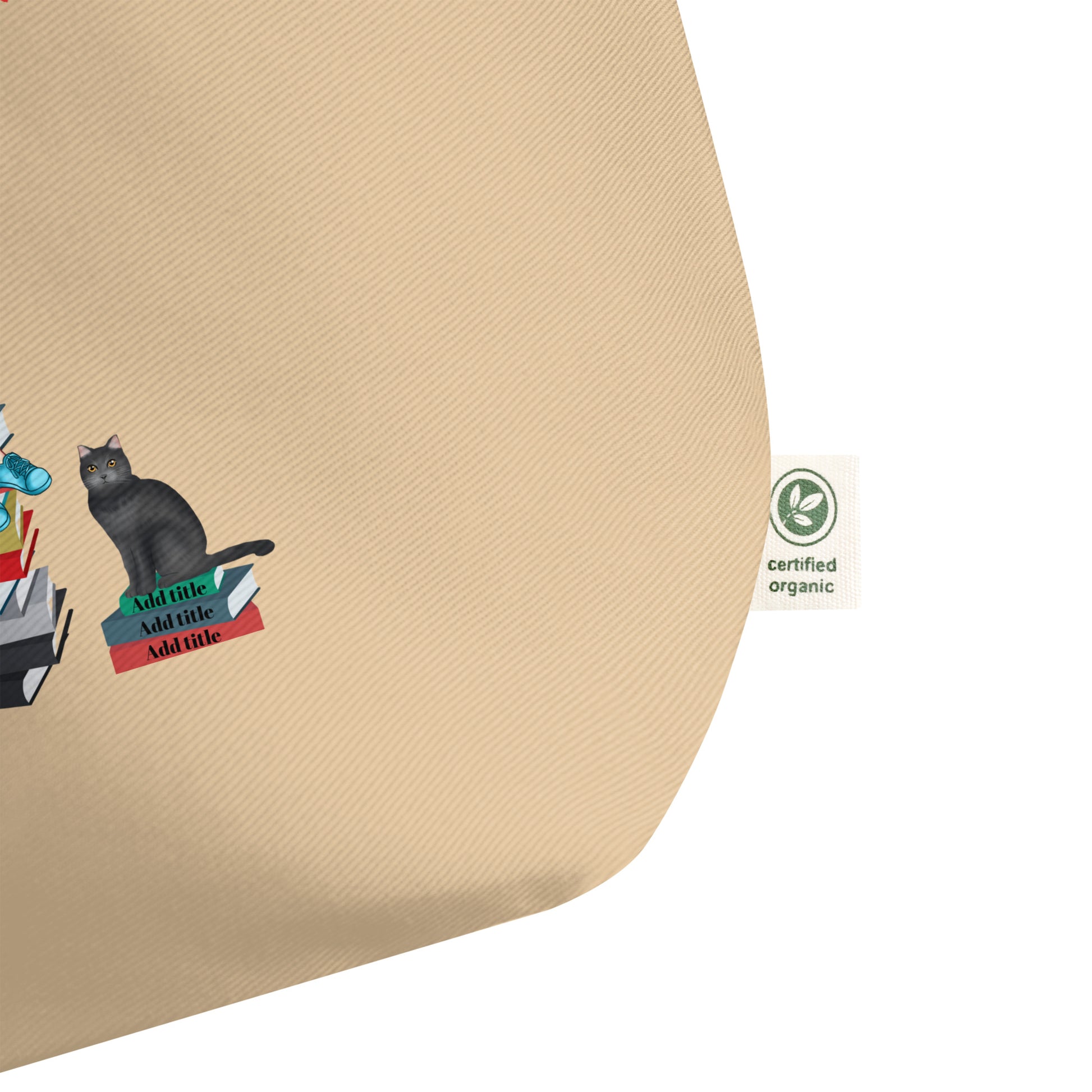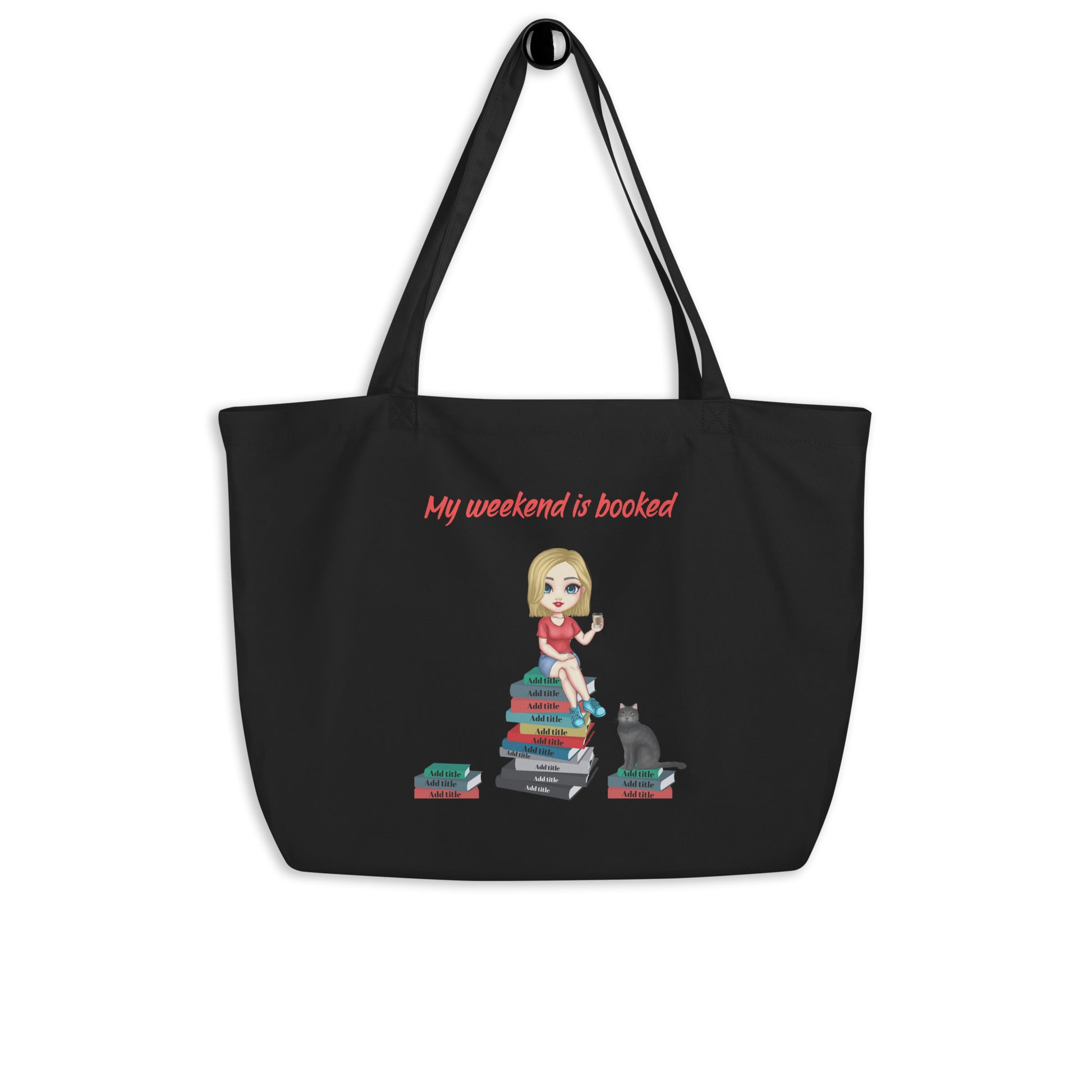 Personalize this organic tote bag with your favorite book titles, author names, pet likenesses, hairstyles, clothes, beverages, and more. This large tote makes a great gift for yourself or a book bestie.